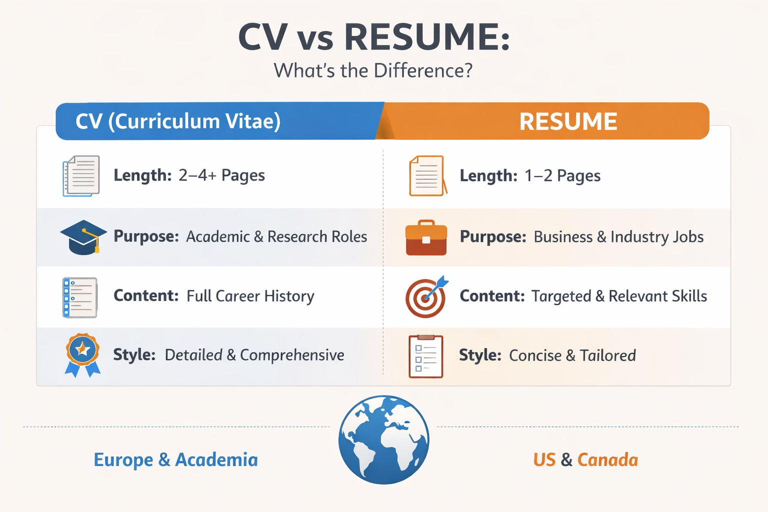 The difference depends heavily on region, industry, and purpose. In the United States, a resume is the standard job application document. In most of Europe, employers expect a CV instead.
