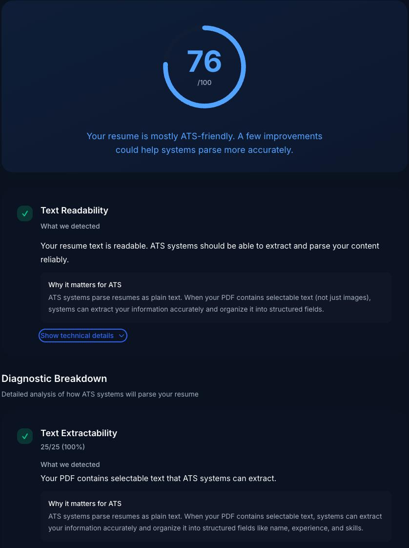 See in seconds whether ATS systems can actually read your resume. There are no paywalls, no accounts, and no hidden steps — just instant, private feedback from a free ATS checker.