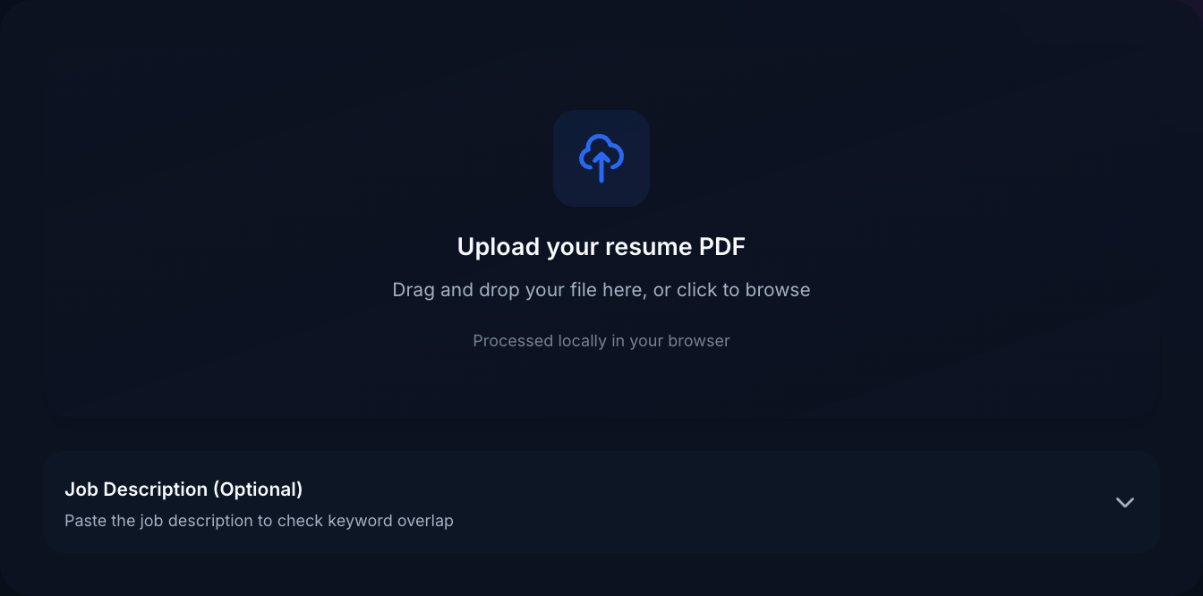 Every analysis is performed in your browser. Your resume is never uploaded or stored.